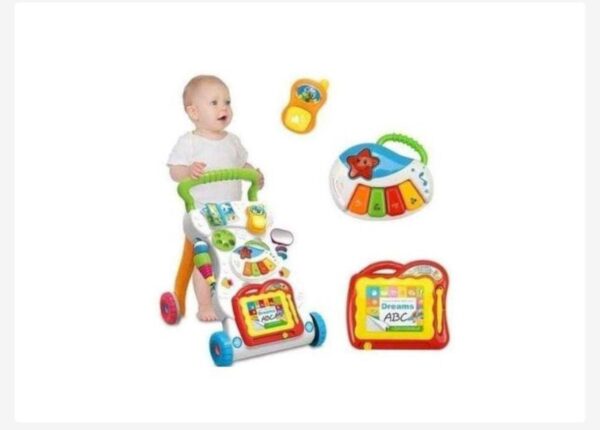 This Sit-to-Stand Learning Walker helps your baby develop from a crawler to a walker through adaptive technology. With a barnyard of playful friends to cheer them on, your little one will have endless fun as they learn to walk. Start out with the easy-to-remove activity panel for floor play or on-the-run fun, then step it up with the fun-to-maneuver walker. With detachable toy mobile phone, musical box, Tablet and some accessories toys.